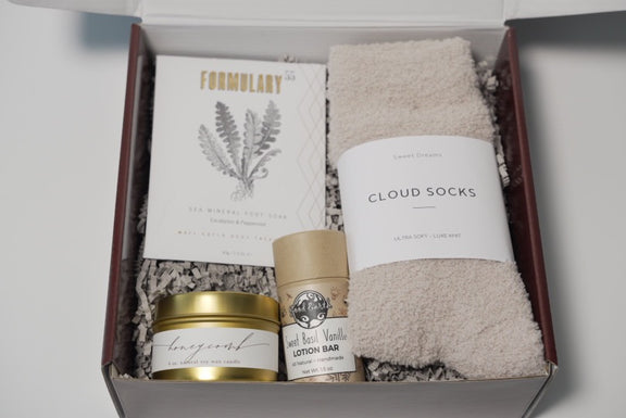 This box is especially sweet for your feet. Enjoy a foot bath with the Formulary 55 sea mineral foot soak in the scent of eucalyptus & peppermint. Follow up the foot treatment with the moisturization from the Good Earth lotion bar in the scent of Sweet Basil Vanilla (which can also be applied to the whole body!). Wrap your feet in the ultra softness of the luxe knit Sweet Dreams Cloud Socks and read a book by the light and smell of the honeycomb natural soy wax candle. Sweet (feet) dreams!